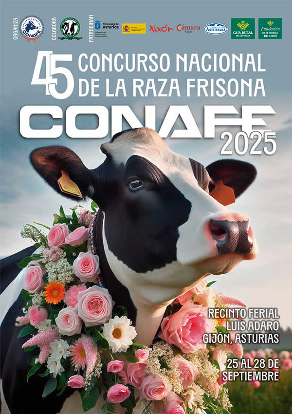 Ya está todo en marcha para celebrar la gran cita anual de la raza frisona en España, el 45ª Concurso Nacional de la Raza Frisona CONAFE 2025, que este año se desarrollará el fin de semana del 27 y 28 de septiembre organizado con la colaboración de Asturiana de Control Lechero-Asociación Frisona (ASCOLAF) y bajo el patrocinio de la Consejería de Desarrollo Rural y Cohesión Territorial Principado de Asturias, el Ayuntamiento de Gijón, el Ministerio de Agricultura, Pesca y Alimentación, la Cámara de Comercio de Gijón, Central Lechera Asturiana, Caja Rural de Gijón y Caja Rural de Asturias.