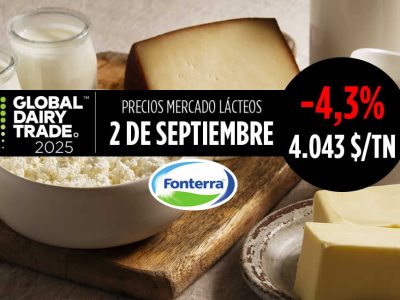 En la sesión 387 del 2 de septiembre, el Global Dairy Trade registra una bajada del -4,3% en su índice...