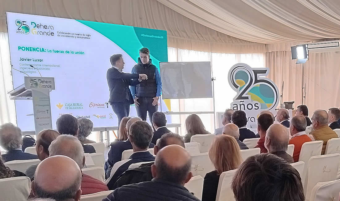 Javier Luxor, conferenciante internacional e ilusionista psicológico, cerró la jornada con una inspiradora ponencia bajo el título “La fuerza de la unión”, en la que destacó el valor del trabajo en equipo y la cohesión como motores de éxito en cualquier organización. A través de dinámicas y ejemplos prácticos, puso en valor la capacidad de las cooperativas como Dehesa Grande para superar retos gracias a la confianza mutua, el compromiso colectivo y la visión compartida.