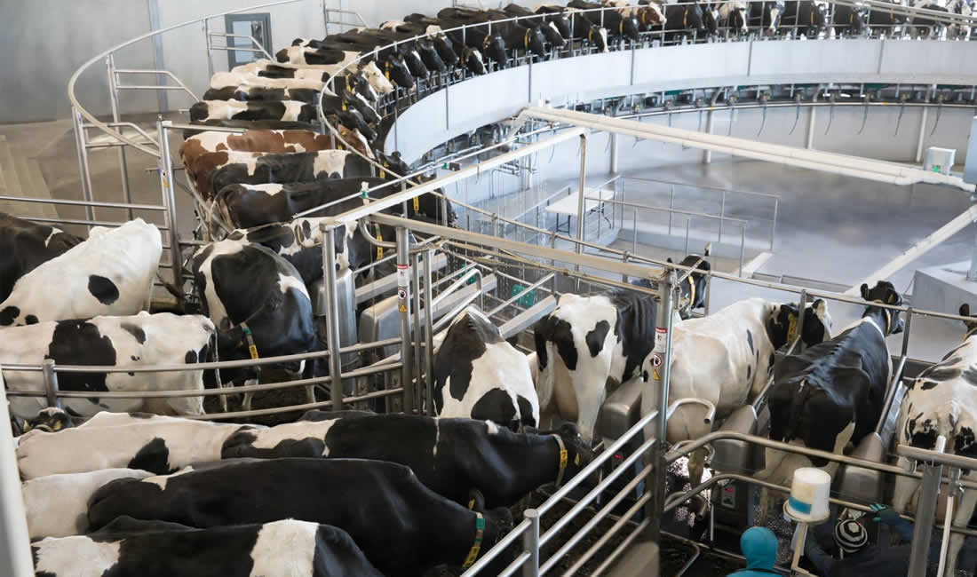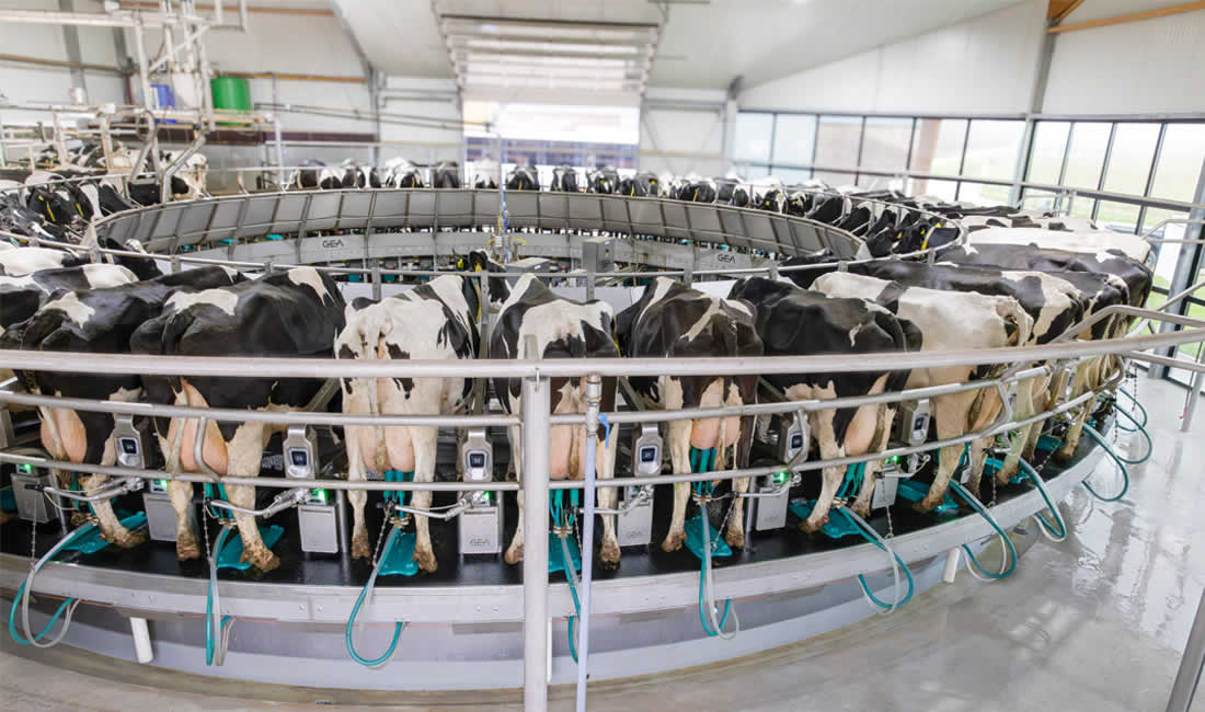 «El flujo de vacas y la comodidad dentro de la rotativa son excepcionales. Las vacas entran tres veces al día y el sistema es capaz de ordeñar hasta 550 vacas por hora, con una nueva vaca subiendo a la plataforma cada 5,3 segundos».
