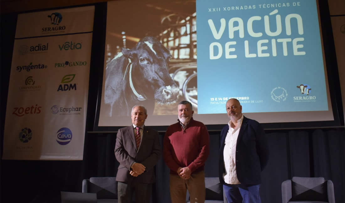 El auditorio de la Facultad de Veterinaria de Lugo acogió hoy la primera parte de la 22.ª edición de las Jornadas Técnicas de Seragro, centrada en temas clave de la producción lechera como la recría, el bienestar animal y el impacto de la tecnología en las explotaciones. En la inauguración estuvieron presentes el presidente de la Diputación de Lugo, José Tomé; el presidente de Seragro, Víctor Manrique, y el decano en funciones de la Facultad de Veterinaria de Lugo, Luis Quintela.