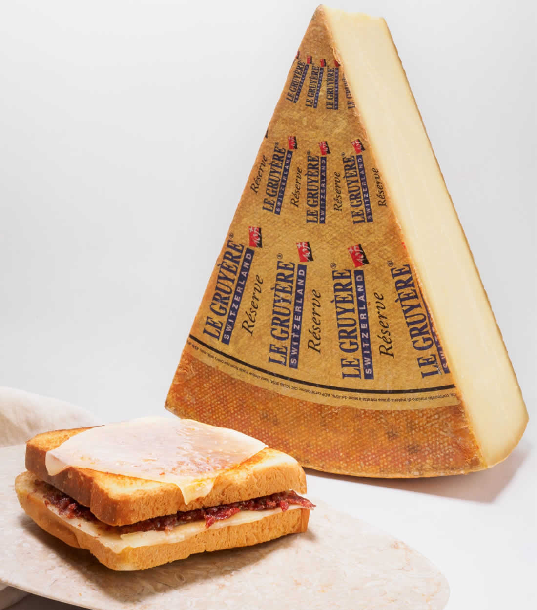 Le Gruyère AOP es un conocido queso de pasta dura que nació sobre el año 1115 cerca de la pequeña ciudad de Gruyères, en el cantón de Friburgo. Hoy en día, se sigue elaborando según la receta tradicional en unas 185 queserías de aldea de Suiza occidental. De aroma fuerte y pronunciado y sabor delicado, Le Gruyère AOP es un queso versátil con un excelente comportamiento al fundirse, por ello encaja también en platos calientes o marcados a la plancha como el sándwich. Sus variedades más conocidas en España son Le Gruyère AOP Clásico (de seis a nueve meses de maduración) y Le Gruyère AOP Reserva (mínimo 10 meses de maduración).