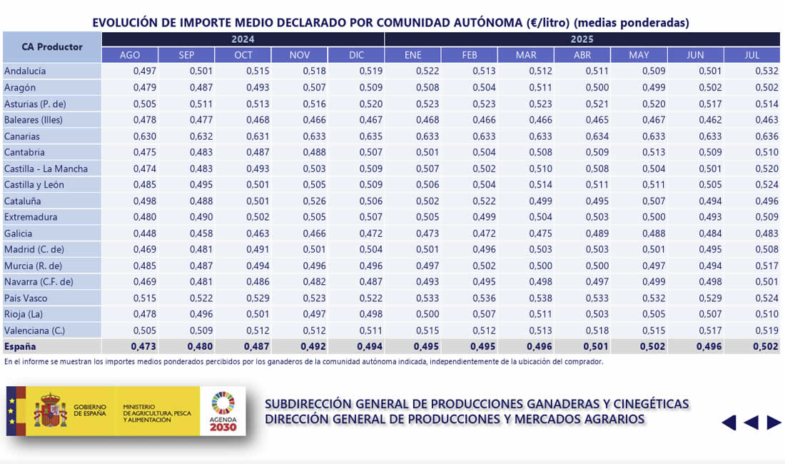 En el mes de JULIO de 2025 el precio medio de la leche subió a 0,502€/litro (Ver AQUÍ informe anterior del mes de JUNIO)