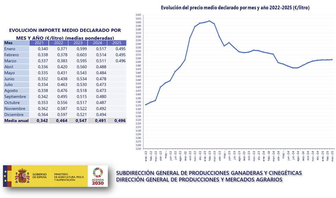 En el mes de MARZO de 2025 el precio medio de la leche subió a 0,496€/litro (Ver AQUÍ informe anterior del mes de FEBRERO)