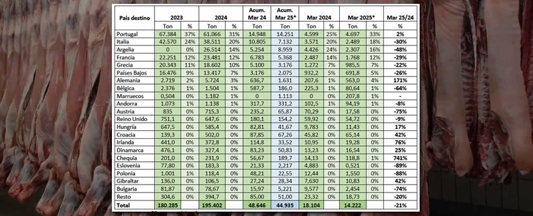 En el mes de marzo de 2025, las exportaciones de carne fresca de vacuno han bajado un -21% con respecto a marzo de 2024. Aunque en muchos de los países las cifras son negativas, encontramos – por ejemplo, Chequia, con un incremento de las exportaciones hacia allí del +741%.