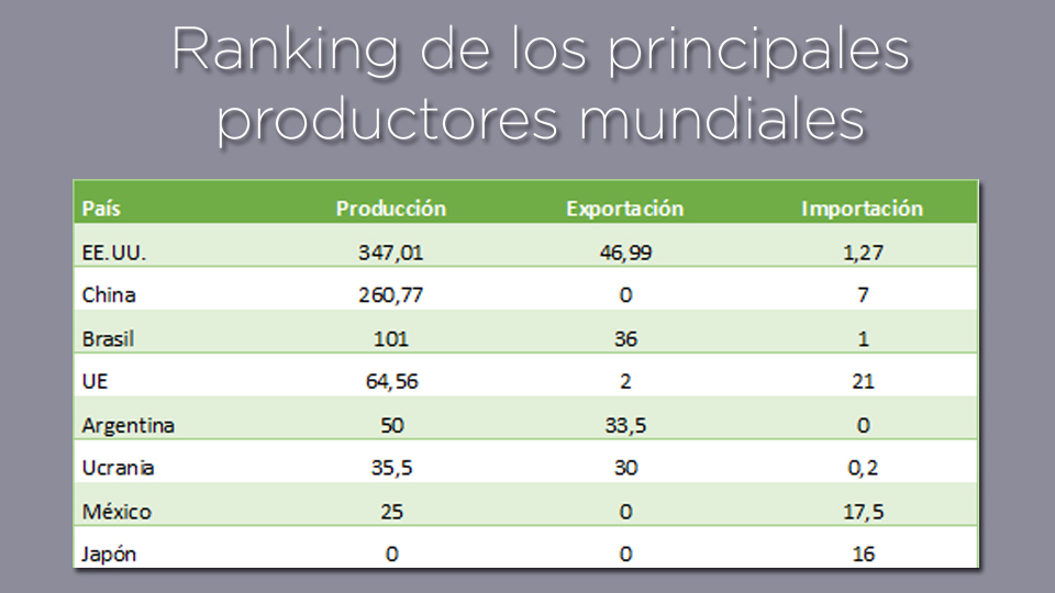 Como siguientes productores mundiales tenemos Argentina y Ucrania, con especial relevancia por su capacidad exportadora.