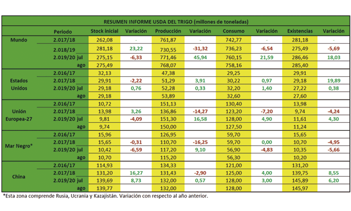 La producción mundial de trigo 2019/20 se reduce a 768,07 (771,46) millones de toneladas por las bajadas de UE y Rusia que disminuyen 1.3 millones de toneladas y 1.2 millones. Las exportaciones mundiales proyectadas bajan 0.5 millones de toneladas mientras el consumo mundial proyectado es 2.0 millones de toneladas más bajo, las existencias finales globales se revisan 1.1 millones de toneladas a la baja fijándose en 285.4 millones de toneladas, pero siguen siendo récord.