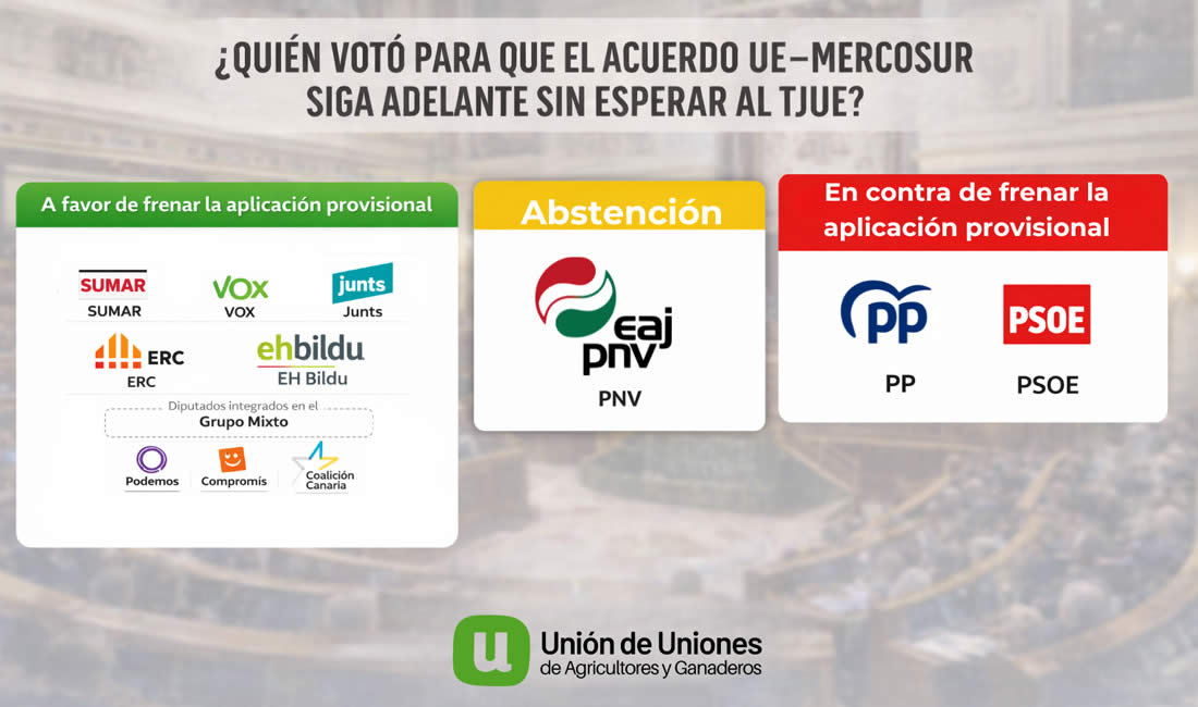 Madrid, 26 de febrero de 2026. Unión de Uniones de Agricultores y Ganaderos, tras la votación de la PNL que ha presentado SUMAR para buscar consenso acerca del acuerdo UE – MERCOSUR y ejercer presión para frenar su puesta en marcha provisional, considera que el voto negativo de PSOE y del PP no respeta la decisión del Parlamento Europeo de poner el texto en manos de la justicia europea.