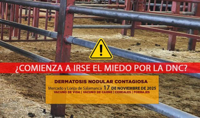La asistencia al mercado de Salamanca de este lunes 17 de noviembre de 2025, continúa siendo nula, por el aplazamiento en la restricción de movimientos como medida ante la Dermatosis Nodular Contagiosa ·· En el vacuno de vida, cambio de precios...